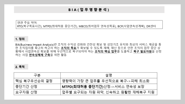 | 5. BCP/BCM 수립 연계 | BIA 결과는 사업연속성계획(BCP)과 경영체계(BCM)수립의 핵심 자료로 활용됨 |